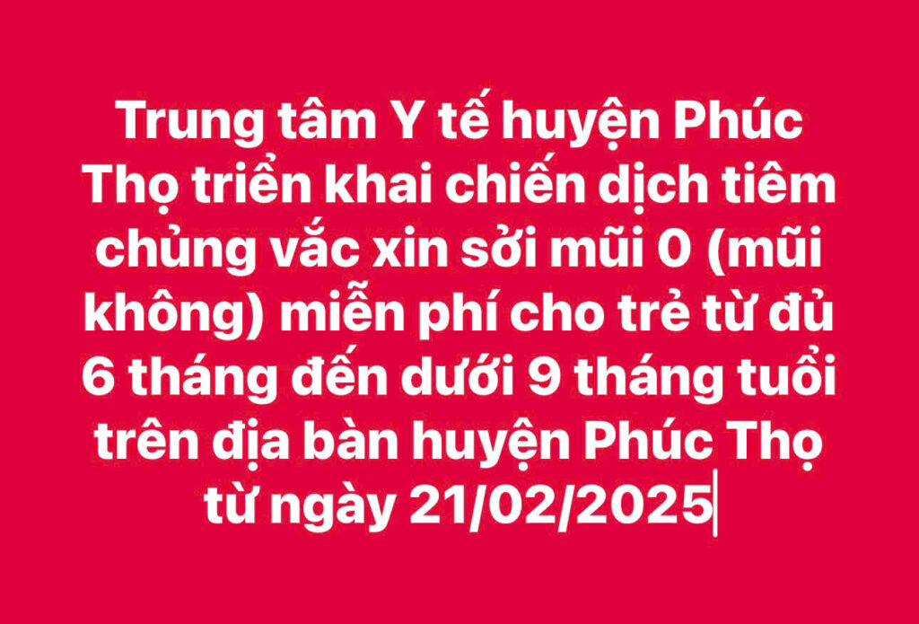 Nhằm tăng cường bảo vệ sức khỏe cho trẻ nhỏ và hạn chế nguy cơ bùng phát dịch sởi, Trung tâm Y tế huyện Phúc Thọ triển khai chiến dịch tiêm chủng vắc xin sởi mũi 0 (mũi không) miễn phí cho trẻ từ đủ 6 tháng đến dưới 9 tháng tuổi trên địa bàn huyện Phúc Thọ từ ngày 21/02/2025.