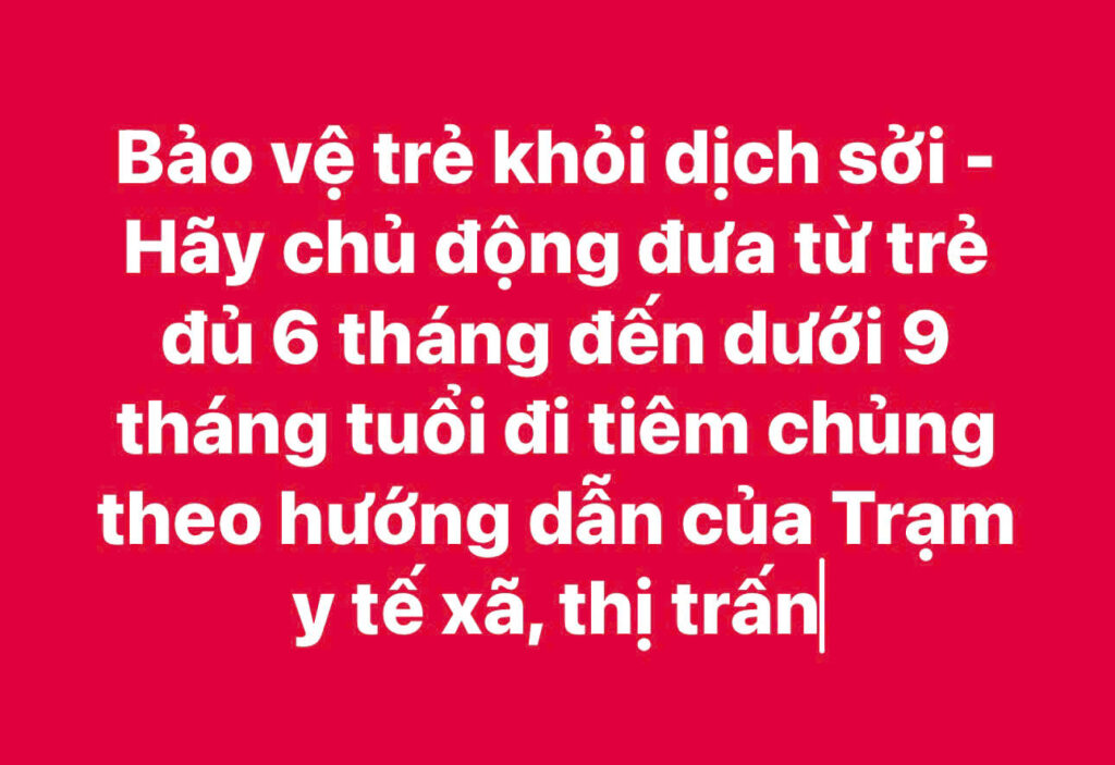 “Bảo vệ trẻ khỏi dịch sởi – Hãy chủ động đưa từ trẻ đủ 6 tháng đến dưới 9 tháng tuổi đi tiêm chủng theo hướng dẫn của Trạm y tế xã, thị trấn.”