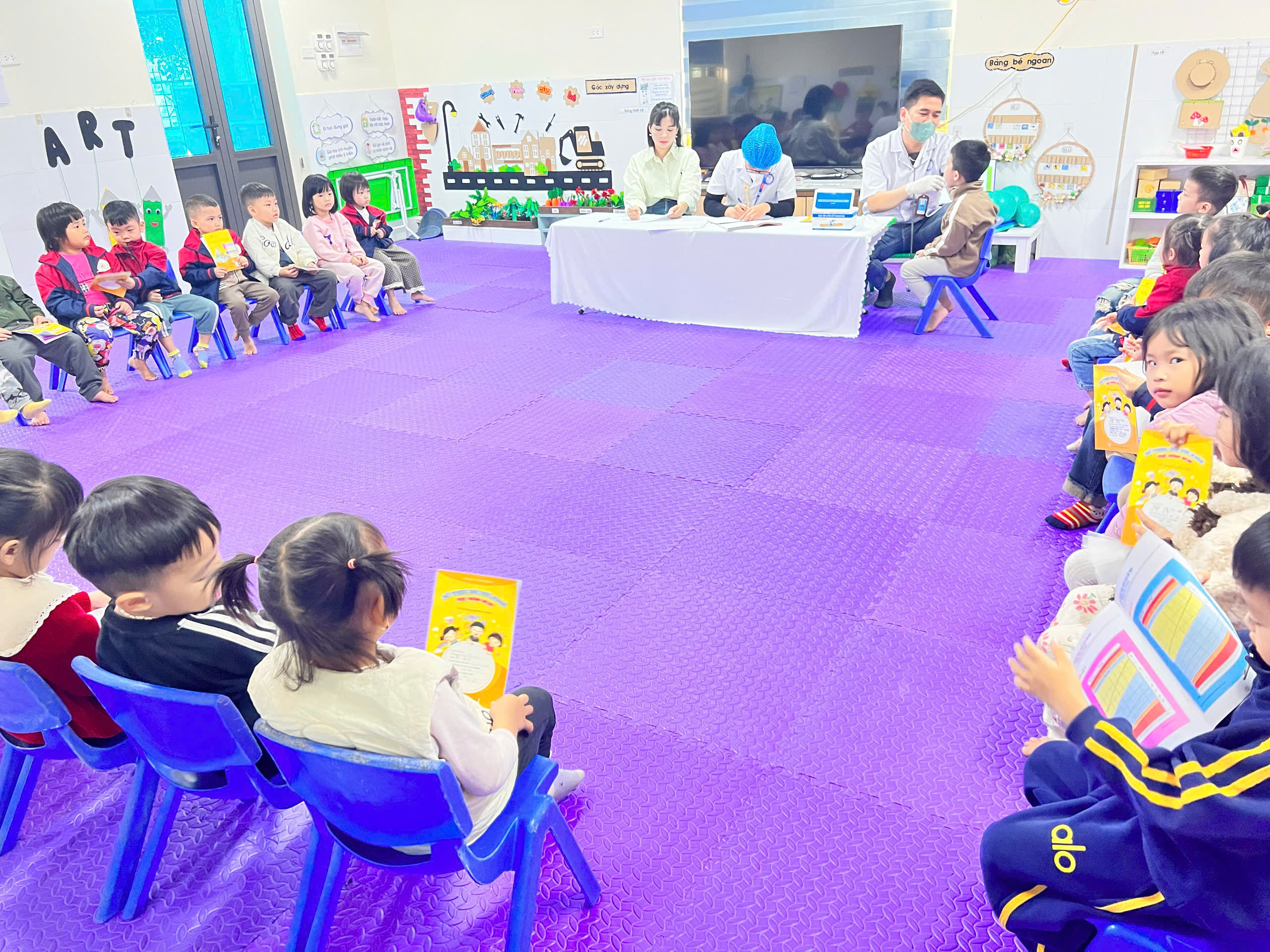 Các bé mầm non hồ hởi, ngoan ngoãn hợp tác và nhiều bạn còn tỏ ra thích thú khi được bác sĩ khám và hỏi han sức khỏe. Không khí buổi khám diễn ra thân thiện, gần gũi, tạo cảm giác thoải mái cho các bé ngay cả lần đầu tiếp xúc.