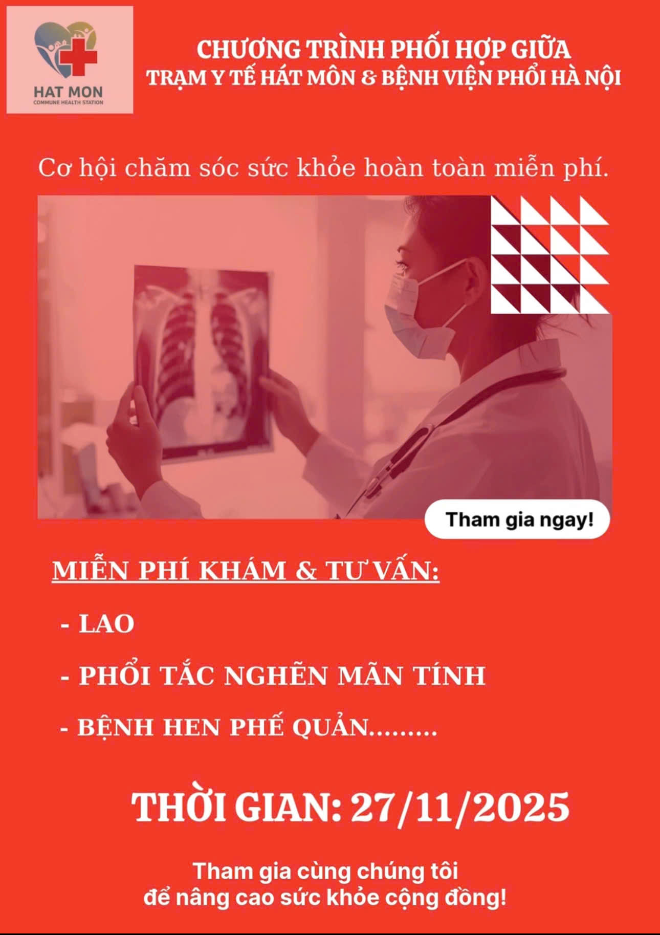 📍 Địa điểm khám: Điểm Y tế Hát Môn (Trạm Y tế Hát Môn cũ) – Thôn Hát Môn 6 – xã Hát Môn – TP Hà Nội