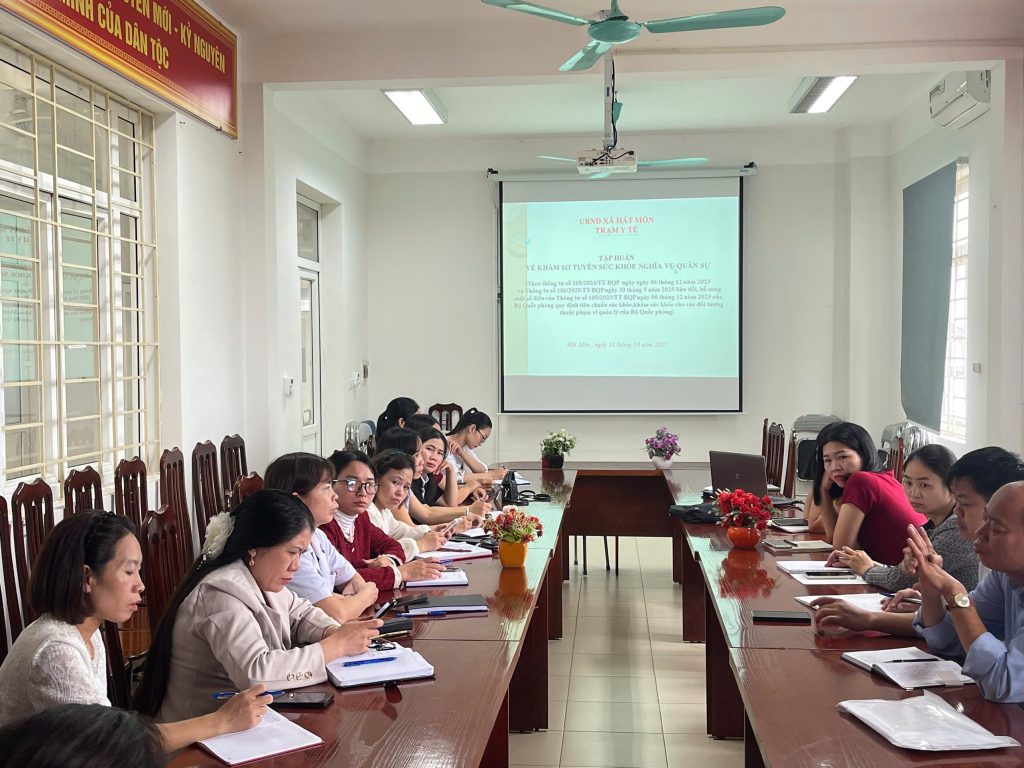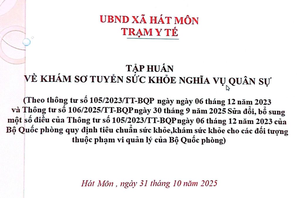 Thực hiện Kế hoạch số 81/KH-TYT ngày 24/10/2025 của Trạm Y tế xã Hát Môn về việc khám sơ tuyển sức khỏe công dân nhập ngũ và thực hiện nghĩa vụ tham gia Công an nhân dân năm 2026, sáng ngày 31/10/2025, Trạm Y tế xã Hát Môn đã tổ chức buổi tập huấn chuyên đề về công tác khám sơ tuyển sức khỏe nghĩa vụ quân sự cho đội ngũ cán bộ, nhân viên y tế trong đơn vị.