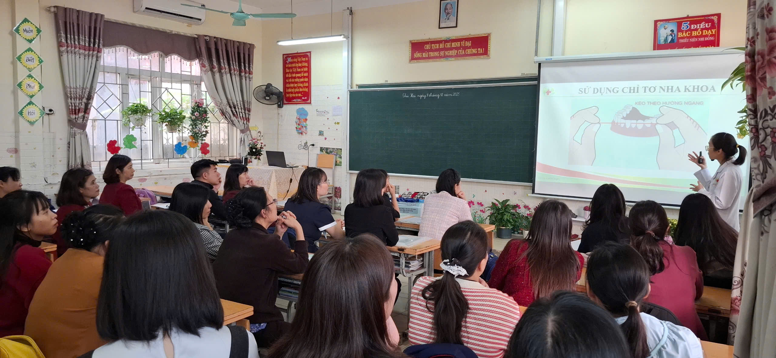 Trong buổi hoạt động, toàn thể Ban giám hiệu và giáo viên, học sinh nhà trường được tham gia tập huấn 1 buổi về nội dung chương trình chăm sóc răng miệng học đường. Buổi tập huấn do bác sĩ chuyên khoa của Bệnh viện Việt Nam – Cu Ba trực tiếp hướng dẫn, giúp giáo viên nắm chắc kiến thức và phương pháp chăm sóc răng miệng cho học sinh theo chuẩn ngành Y tế.